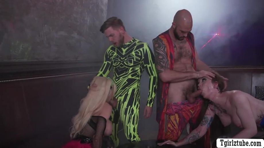 Beschreibung : Two busty shemales Gracie Jane and Brittney Kade are so wild in the club.After that,they go straight to the room and suck two guys big cock passionately.Next is,they let the guy bareback fuck their wet asses in double penetration.