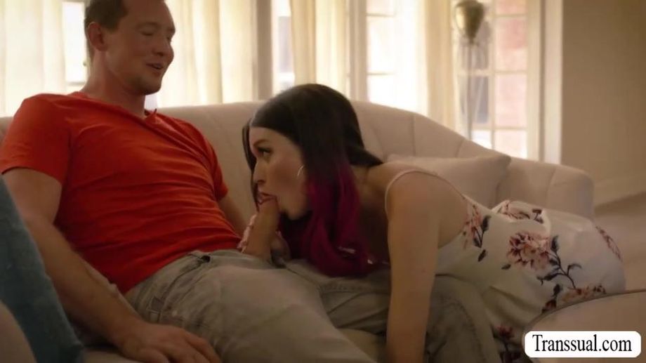 Description : Slut shemale Natalie Stone lets her new boyfriend enter her house and they start kissing each other on the couch.After that,she throats his hard big cock passionately and in return,the guy licks her ass first before he barebacks it so deep and hard.