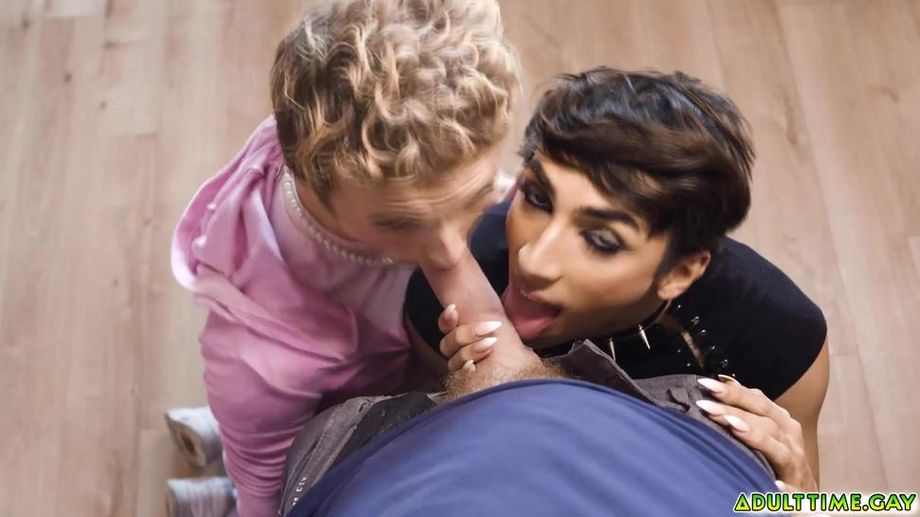 Descrizione : Foxy Alex and Benny Fox get on their knees to give Mateo Tomas a double blowjob and then switch out for some spit roast fun Mateo then gets the femboys into a stack and takes turns pounding their tight assholes as they squirm on top of each other