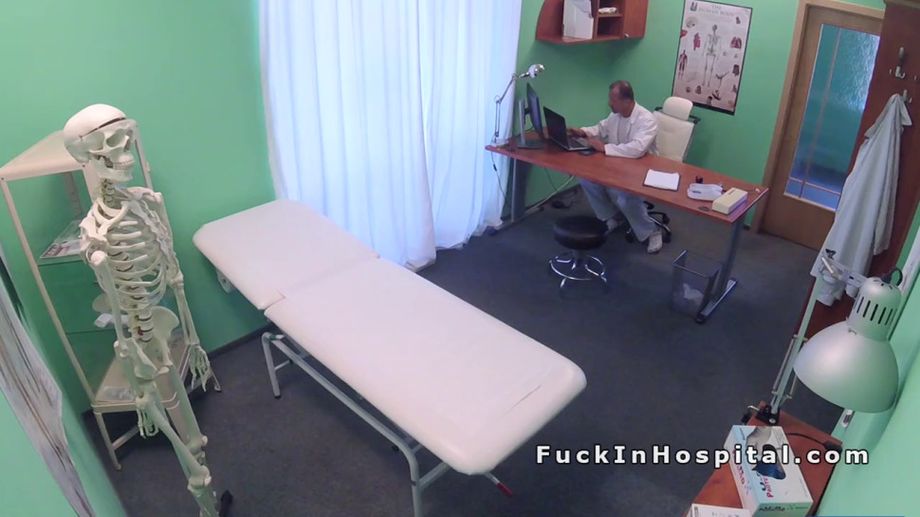 Descrizione : Petite European brunette patient asks doctor for another examination in his office in fake hospital so he fucks her throat and pussy on a desk and examining bed