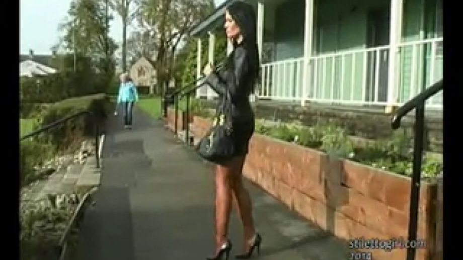 Descrizione: Sexy babe teases her legs nylon stockings and high stilettos