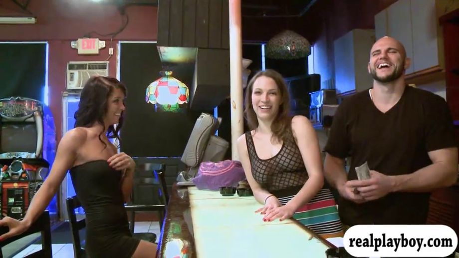 Descrizione: Two brunette babes giving a nice sloppy blowjob and getting their pussies fucked by nasty man in the bar for money