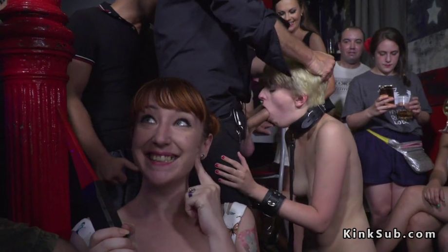 Descrizione: Short haired blonde slave Molly Saint Rose in denim cutoffs disgraced in public then in bar with bare pussy got throat and pussy fucked for then crowd