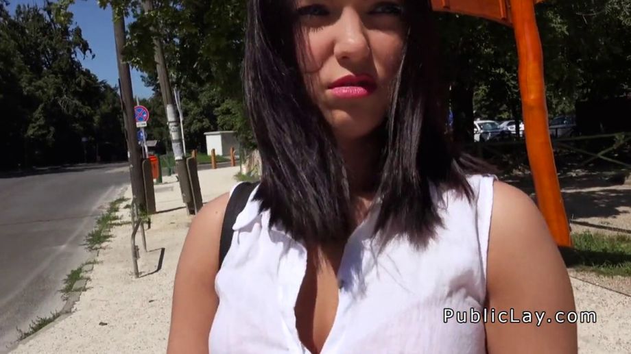 Descrizione : European hot brunette babe Jenny Sapphire in see through shirt and jeans shorts waiting for a bus when stranger gives her money for her tight pussy fucking in public