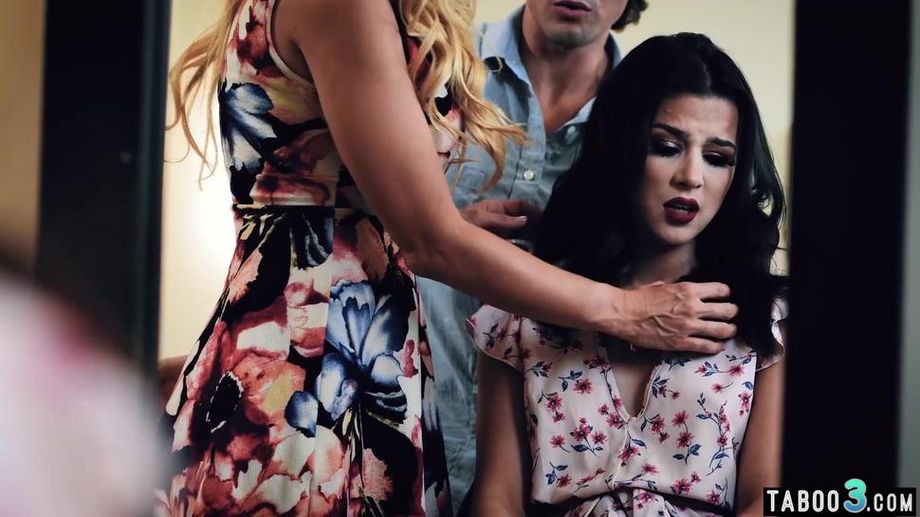 Beschrijving : Gullible brunette teen Kylie Rocket manipulated into losing her virginity by a bisexual blonde MILF Katie Morgan with big boobs and her big cocked stepson They tasting her shaved pussy and fucking it roughly