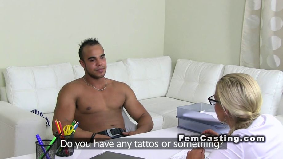 Descriere : Shy muscled guy has casting interview with sexy blonde female agent and her camera assistant then he shoves his big cock in her pussy on the couch